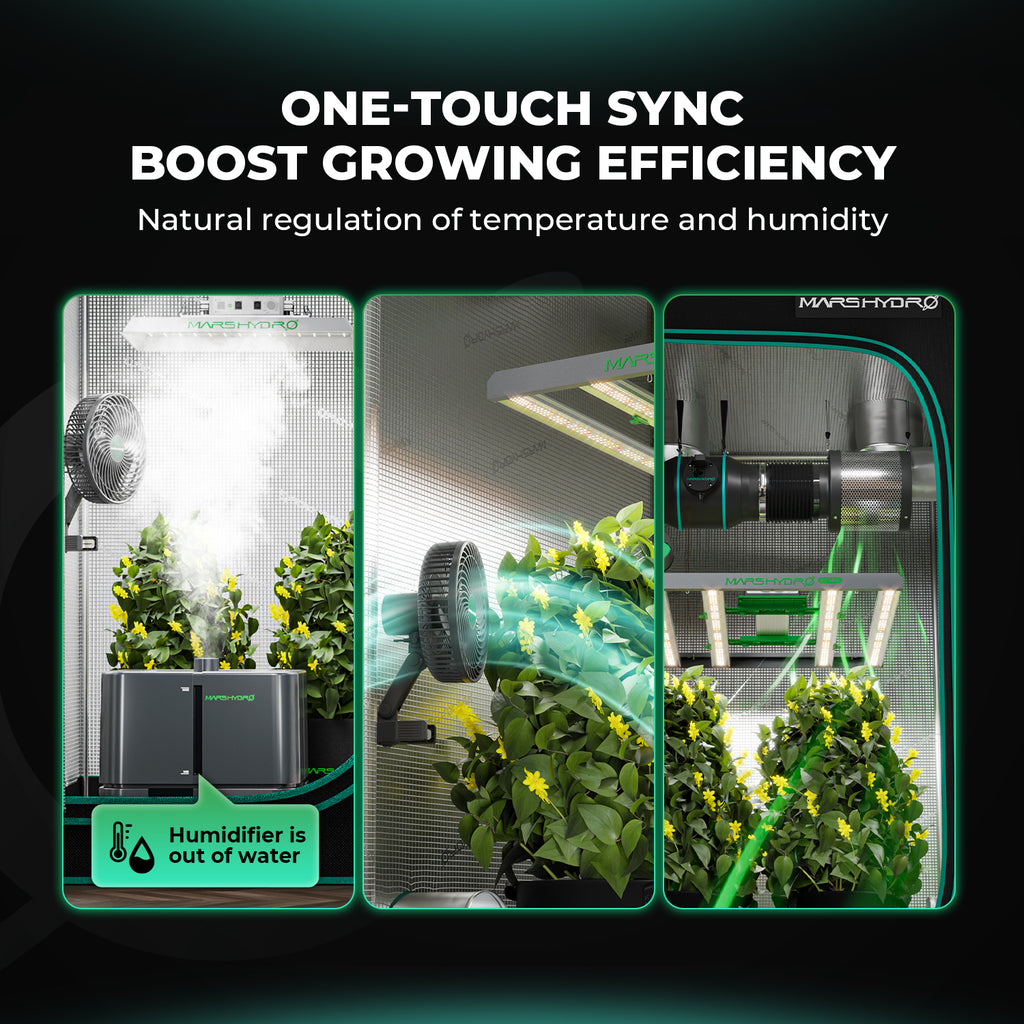 App-Steuerung und intelligente Benachrichtigungen: Verwalten Sie Ihren Anbau über WLAN oder Bluetooth. Sehen Sie sich Echtzeitdaten an und erhalten Sie Warnmeldungen bei Verbindungsabbrüchen, Temperaturspitzen, niedrigem Wasserstand und mehr.