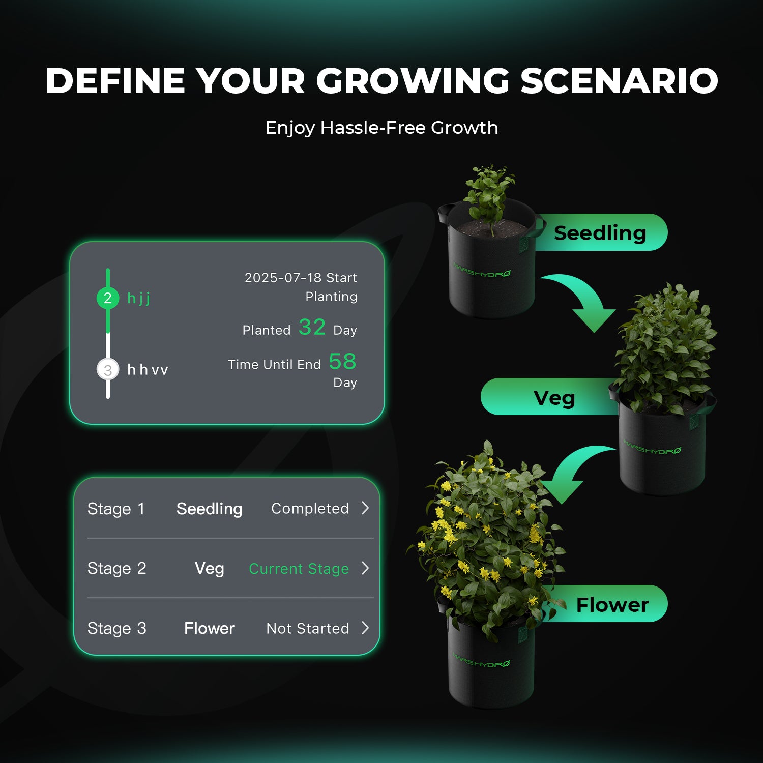 Automatisierung der Wachstumsphase: App-basierte Szeneneinstellungen passen Geräte automatisch an das Wachstumsstadium der Pflanze an. Einmal einstellen und freihändig wachsen lassen.