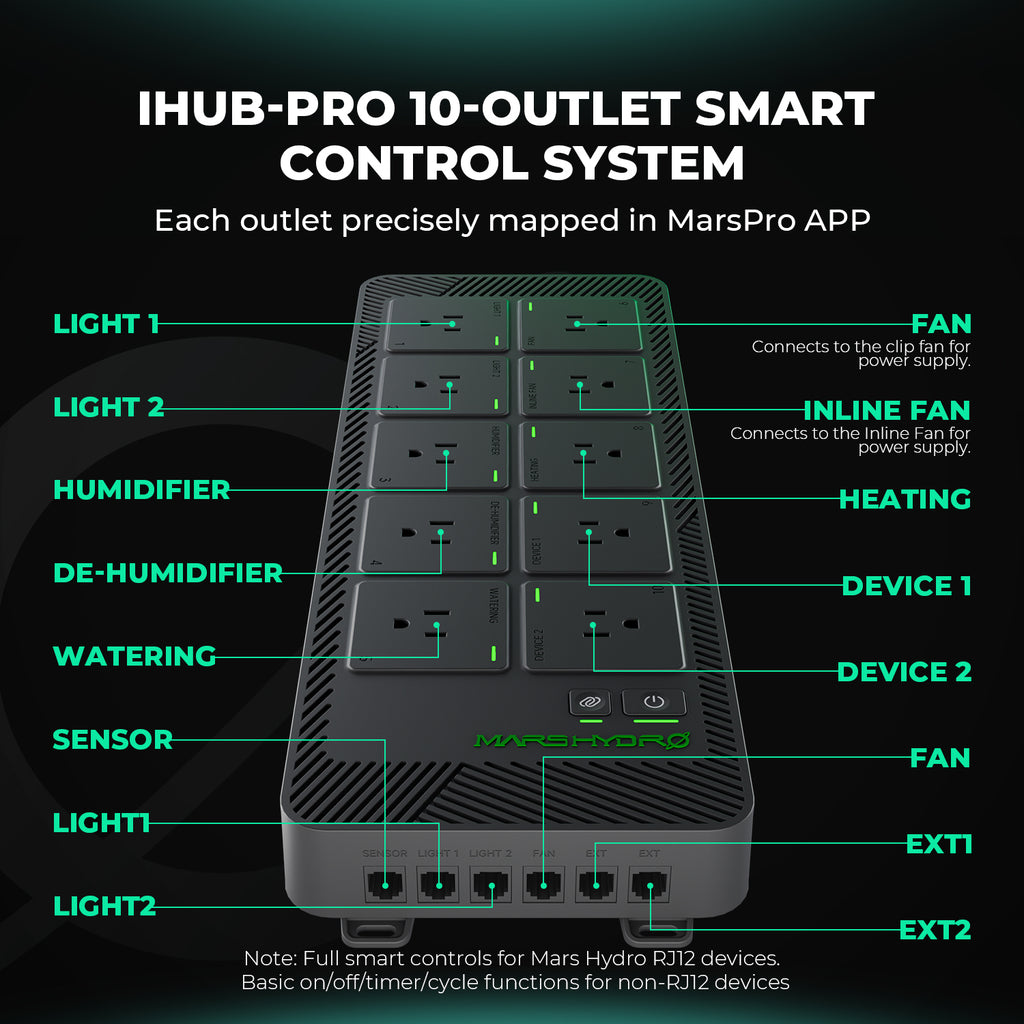 Der iHub Pro verfügt über 10 vorbeschriftete Smart-Steckdosen zur Stromversorgung und Steuerung aller wichtigen Anbaugeräte, darunter: 2 LED-Wachstumslampen, Inline-Ventilator, Clip-Ventilator, Luftbefeuchter, Luftentfeuchter, Tropfbewässerungssystem, Heizmatte, Heizung und 2 anpassbare Steckdosen. Vereinfachen und zentralisieren Sie die Einrichtung Ihres Anbauraums mit einem einzigen intelligenten Hub.