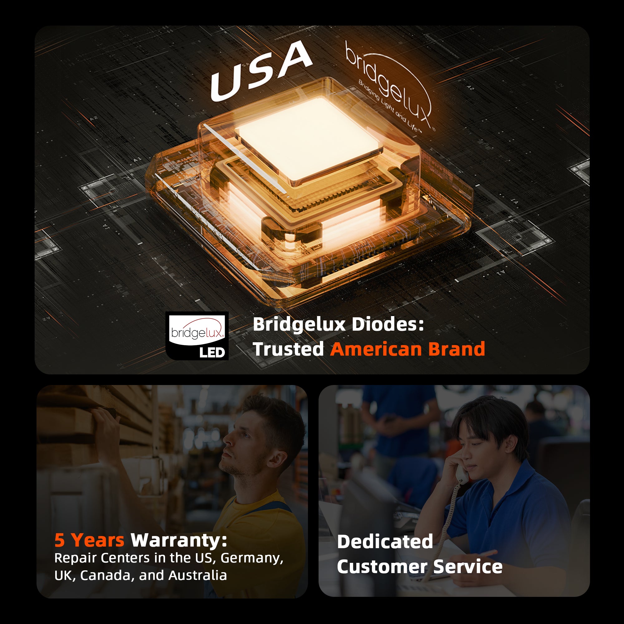 Die G-Serie ist unsere neueste Economy-Linie. Der Hauptgrund für die Wahl der G-Serie ist die Verwendung von Dioden der amerikanischen Marke Bridgelux. Diese Serie verfügt über die höchste LED-Dichte in unserem Sortiment und bietet eine außergewöhnliche Lichtdurchdringung und -abdeckung. Die hohe LED-Dichte sorgt außerdem dafür, dass weniger Energie durch jede Diode fließt, wodurch sie effizienter und mit weniger Wärme arbeiten. Mit der G-Serie sparen Sie Geld und erzielen gleichzeitig bessere Ergebnisse.